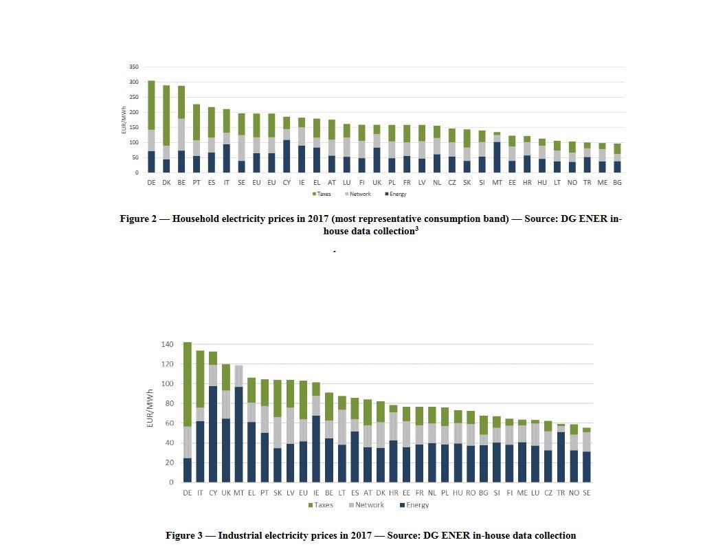 Germany has the highest electricity prices in Europe both for households and industry, according to EU data. German households are the only ones in the EU which paid more than 30 eurocents per kilowatt hour (KWh) in 2017 in the consumption band compared, in contrast to an EU average of slightly below 20 eurocents/KWh. The country’s industrial companies on average pay more than 14 eurocents/KWh, also an EU record, compared to an EU average of slightly over 10 eurocents.