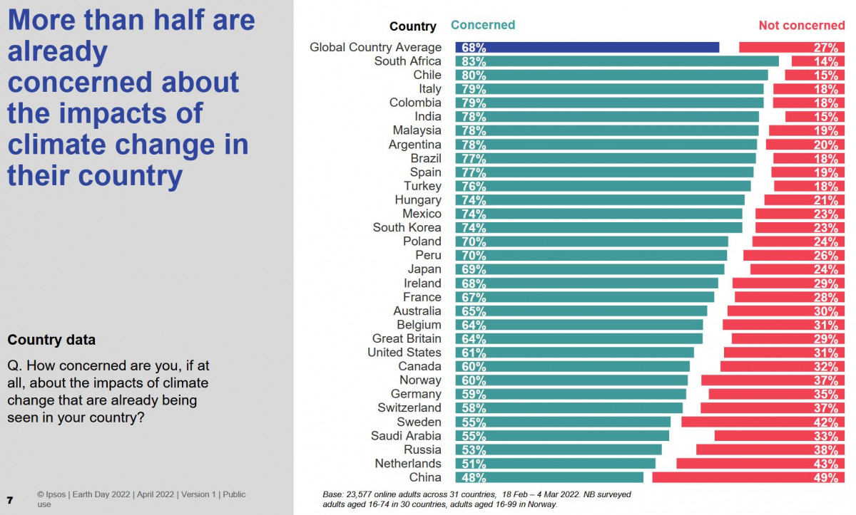 Ipsos found that climate change is a regular concern for only half of the people around the world. “Despite seven in 10 people being concerned about the impact of climate change on our planet, for the majority of people globally there are other issues they feel are more pressing, such as their family’s health, war, financial concerns and the ongoing pandemic,” said Pippa Bailey, head of UK Climate Change & Sustainability Practice at Ipsos.