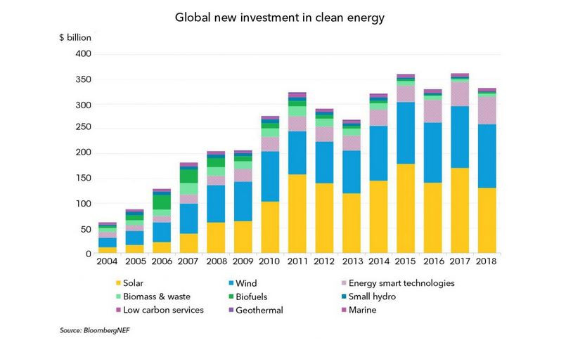 Germany ranks fifth in Bloomberg’s 2018 global renewable investment report. China remains the leader with total investments of 100.1 billion dollars, followed by the US (64.2 billion), Japan (27.2 billion), India (11.1 billion), and Germany (10.5 billion). Global nominal renewable investments fell 8 percent to 332.1 billion dollars, mainly due to policy changes in China and the falling cost of renewables, particularly solar. Overall solar investment dropped 24 percent in monetary terms, but a sharp decline in capital costs meant global PV installations actually increased from 99 gigawatts (GW) in 2017 to 109 GW in 2018. New wind capacity was also up slightly last year.