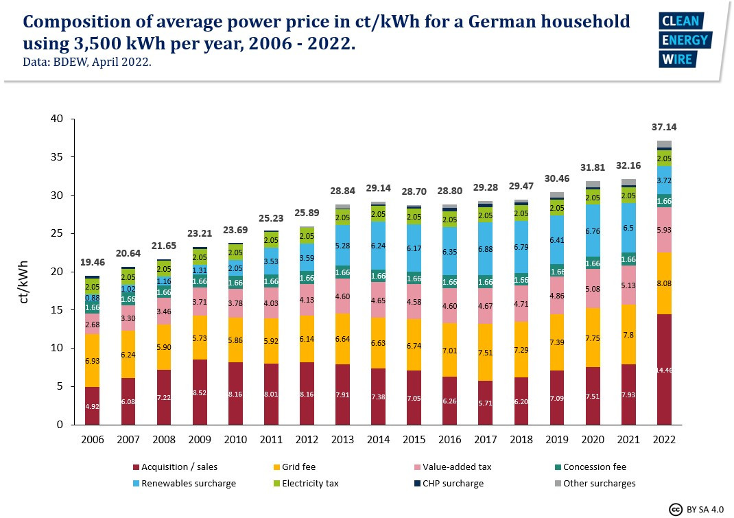 Abolishing the surcharge has been on the government agenda for some time, as a measure to lower household power prices which are among the highest in Europe. As of January 2022, the surcharge was almost halved to 3.7 ct/kWh. The new three-party government initially announced in its 2021 coalition agreement that the levy was going to stop by the end of 2022, reasoning that lower power costs would make electric transport (e-cars) and heating (heat pumps) cheaper and thus more attractive than fossil-fuelled alternatives. However, rising energy prices due to the shortage of Russian gas and the war in Ukraine prompted the government to introduce the abolishment earlier, as a relief measure for households. “Unfortunately, the 3.7 cent reduction in electricity prices on 1 July […] is little more than a drop in the ocean in view of current developments on the energy markets,” Andreae said. According to supplier platform Check24, most of what consumers save in renewables payments, is eaten up by an average electricity price increase of 471 euros since October 2021 (4-person household 5,000 kWh).