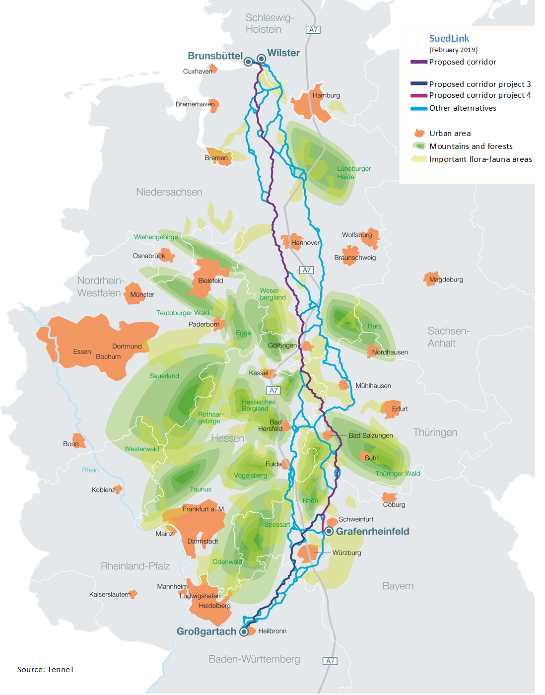 Grid operators TenneT and TransnetBW have presented their detailed plans for the route of Germany’s large north-south electricity line “SuedLink”, running from windy Schleswig-Holstein down to power-hungry Bavaria and Baden-Württemberg. The 700 km connection will consist of two HVDC (high voltage direct current) power cables. TenneT and TransnetBW say the investment volume for the new connection will be around 10 billion euros. Each line will have a capacity of two gigawatts. The proposed route will be publicly consulted as of March 2019 and a final decision by the Federal Network Agency is due to be taken by the end of the year. In a best-case scenario without long delays, the grid operators want to complete the line by 2025. People and communities affected by the new connections are arguing that a more local supply with renewable power would make large scale grid solutions redundant. Local opposition and legal challenges could therefore delay the project.