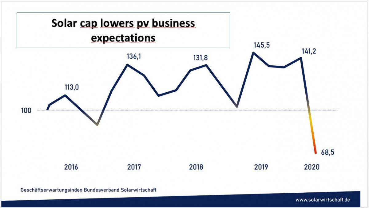 The business confidence of Germany's photovoltaic companies has collapsed in recent weeks due to the looming cap for support payments, according to a survey by industry lobby group BSW Solar. Business expectations halved within three months not because of the effects of the coronavirus pandemic, but because the 52 GW solar cap limit to feed-in tariffs will be reached soon, the association said. "We have never before seen a comparable decline in such a short time. More and more solar companies fear for their existence," said the group's head Carsten Körnig. He added the corona crisis had little effect on demand so far. He said the limit will likely be reached this summer, and that a growing number of large projects are already being cancelled. The association's business expectations index fell to 68.5 from 141.2 points quarter-on-quarter.