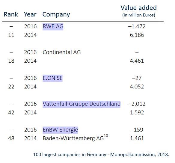 The “big four” utilities in Germany - RWE, E.ON, Vattenfall Germany, and EnBW - have all disappeared from a list of the country’s 100 largest companies compiled by the German Monopolies Commission, the competition watchdog says in its annual report. The list ranks companies according to their economic value added, the number of employees, and total sales volumes in 2016. While the big four utilities were still among the country’s top 50 companies in the 2014, they were all but gone from the top 100 two years later, the 2018 report says. “The Energiewende has caused major restructuring in these companies,” the monopolies commission writes. The split-off of subsidiaries at RWE, which used to be ranked 11th in 2014, and at E.ON, formerly 22nd, has significantly reduced both company’s individual economic weight and the “value correction” of their conventional energy generation capacities, the commission says.