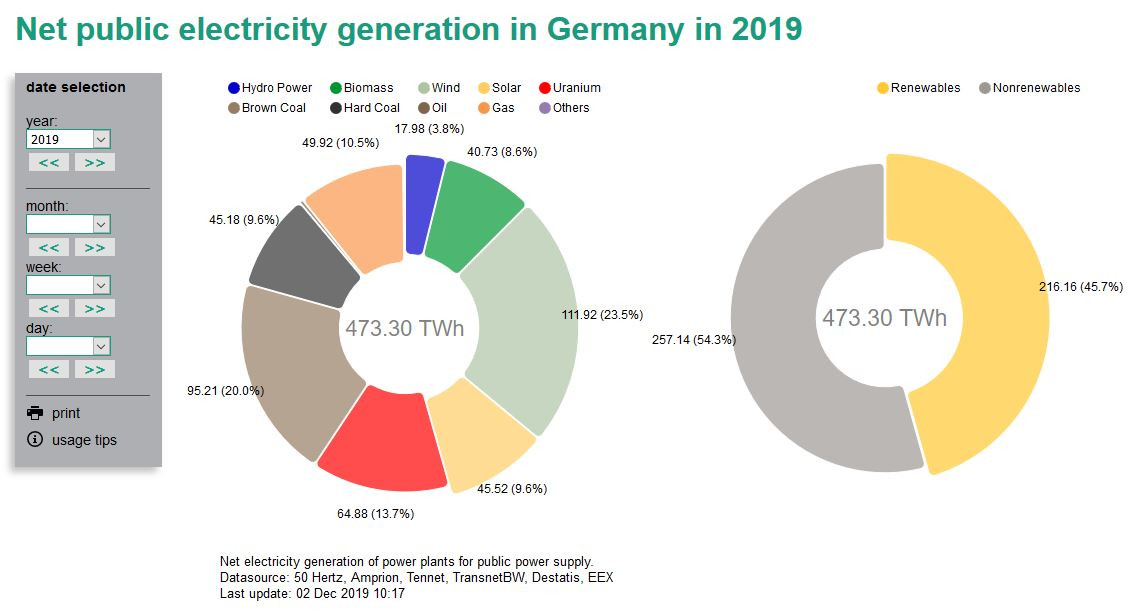 Power production with renewable energy sources is set to overtake fossil energy sources over the course of a whole year for the first time in 2019, according to calculations undertaken by the research institute Fraunhofer ISE. "In the first eleven months of this year, renewable energies in Germany already generated 24 TWh (terawatt hours) more electricity than fossil energies," Fraunhofer ISE professor Bruno Burger wrote on Twitter, adding that this meant renewables will be ahead of fossil fuels in net electricity generation for the first time. According to energy charts on Fraunhofer ISE's website, renewables have so far accounted for nearly 46 percent of Germany's electricity production this year. The website does not include data on the amount of power the generating facilities consume themselves to operate, or the power German industry produces and consumes without it being fed into the public grid. Fraunhofer ISE says their data represents the power mix that actually supplies German homes.