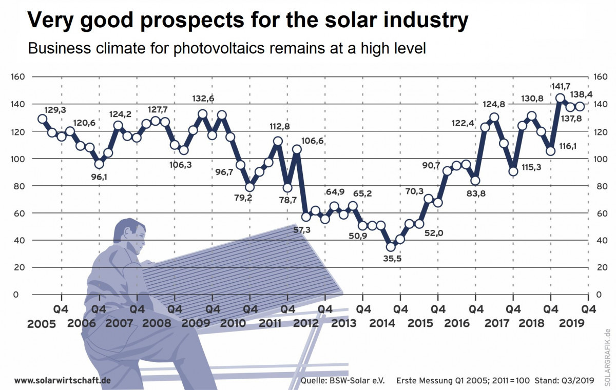 The decline of Germany's solar power industry has long been common wisdom among energy market observers. A boom in the early 2000s was followed by a rapid decline around 2010 that saw many of the technology's pioneers go out of business due to much cheaper Chinese competitors that benefited from Germany's renewable support. However, business confidence in the sector has bounced back considerably in recent years and the German solar industry today looks ahead at 2020 with much more optimism than many had thought possible just a few years back. Figures released by solar power industry lobby group BSW Solar published in late 2019 confirmed that solar companies have regained confidence, partly driven by the government's climate package, which promised a removal of the current cap on support at 52 gigawatts (GW) – a capacity level expected to be reached soon.