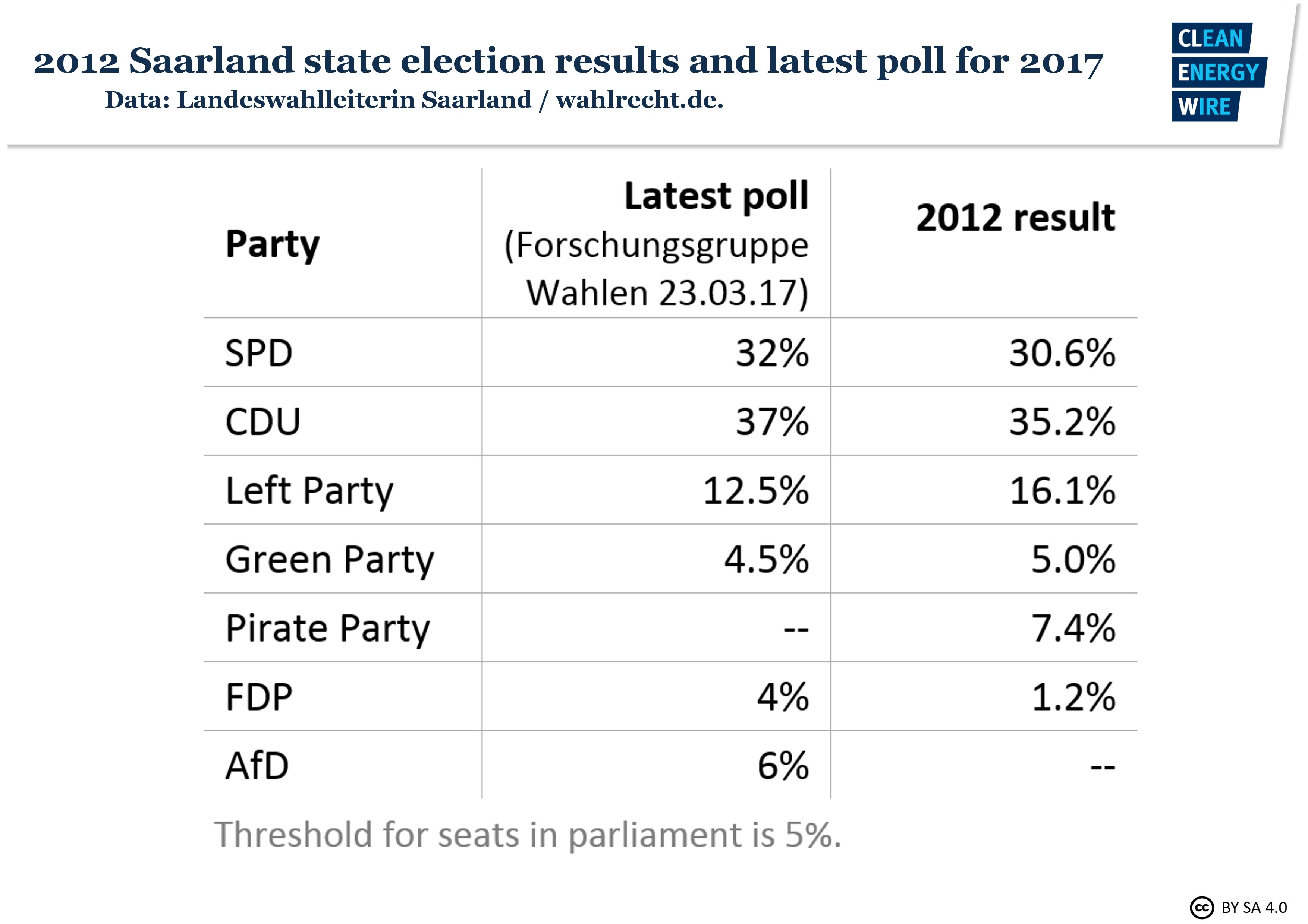 The so-called “Schulz-effect” makes the election a first test for possible coalitions on the federal level and thus the next "Energiewende government". Like at the federal level, Saarland is currently governed by a grand coalition of Germany's two largest parties, the conservative CDU and the SPD.