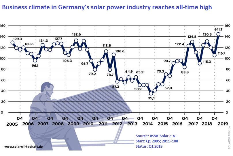 The business climate index of Germany’s solar power industry has reached a new all-time high in the first months of 2019, a survey by national solar power lobby group BSW Solar has revealed. “Revenue and employment figures are on the rise. We expect double-digit growth rates this year,” BSW Solar head Carsten Körnig said, arguing that technological innovation and a growing awareness of climate action allowed the industry to have a very optimistic outlook. Körnig said he expected the German government to set much higher expansion goals for solar power soon as the technology was key for reaching the country’s emissions reduction targets and had almost reached financial independence from state support thanks to falling costs. “When installing new power production capacities, solar power almost can no longer be beaten in terms of acceptance, expansion speed and cost-benefit-ratio,” he said. According to the BSW Solar, one in two house owners in Germany considers installing solar panels on their roof and one in four thinks about setting up their own e-car filling station.