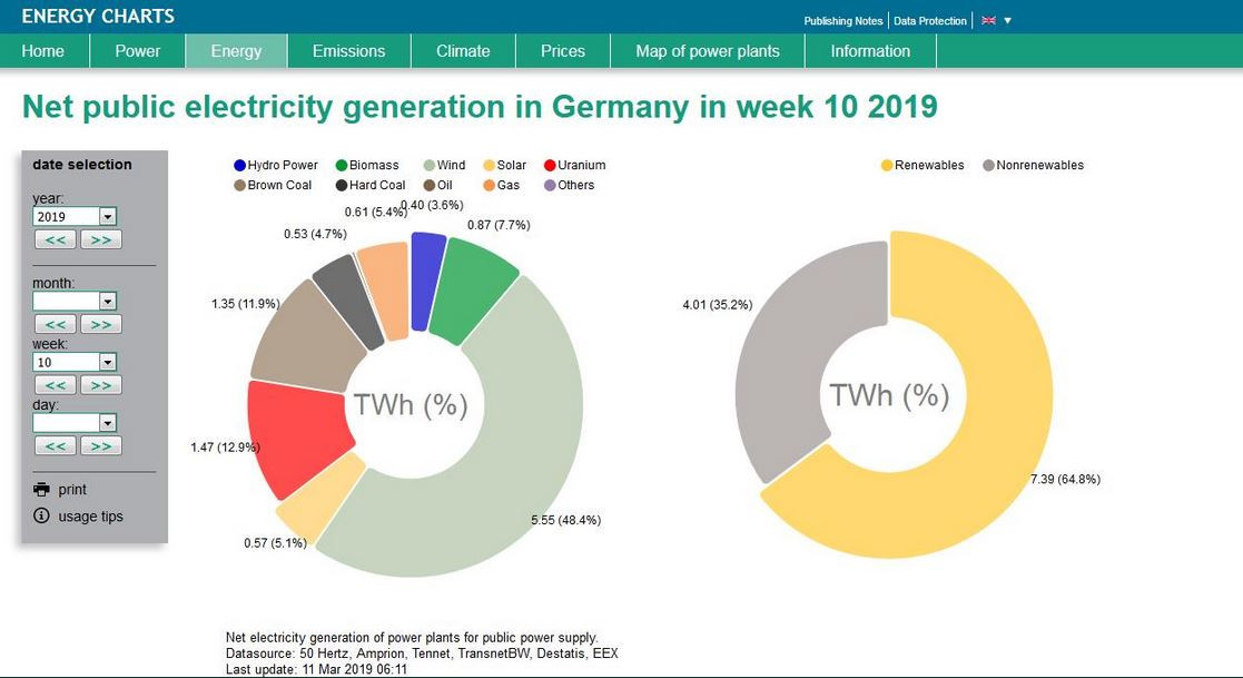Thanks to strong winds, electricity production in Germany achieved a new record share of nearly 65 percent renewables last week, research institute Fraunhofer ISE has found. Wind turbines, solar panels and other renewable energy sources contributed 64.8 percent to the country’s net power production between March 4 and 10, the institute says in a press release. Wind power turbines alone reached the new record share of 48.4 percent of power production in Europe’s biggest economy. “These figures show that the envisaged goal [of the German government] of 65 percent renewables by 2030 is technically feasible,” researcher Bruno Burger said, adding that the goal now was to sustain a high renewables share for an entire year. According to Fraunhofer, lignite and hard coal plants only ran at minimum output during that week, while nuclear plants were curtailed during the night. The share of lignite in the power production mix fell to 12 percent, half of its average share in 2018. While the share of renewables overall reached 40.2 percent in 2018, it stood at 43.3 percent after the first ten weeks of 2019, Fraunhofer added.